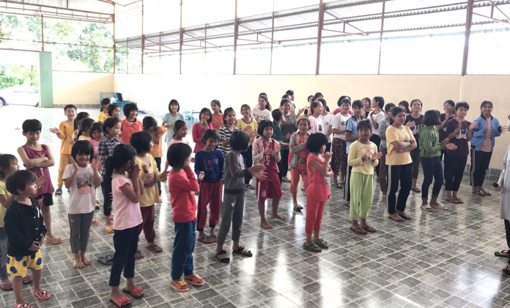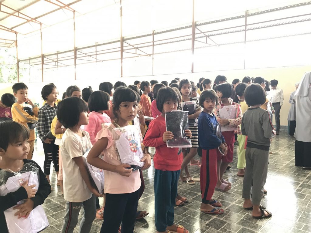 07h30 đoàn của chúng tôi xuất phát đến Phaolô Thiên Ân, khi đoàn chúng tôi vừa đến thì các em cũng đã tập trung đầy đủ, trên gương mặt với vẻ háo hức và đợi chờ những phần quà mà vốn dĩ bao đứa trẻ bình thường sẽ có là những đồ dùng học tập, sách vở, đồ chơi, áo quần và những vật dụng cá nhân
